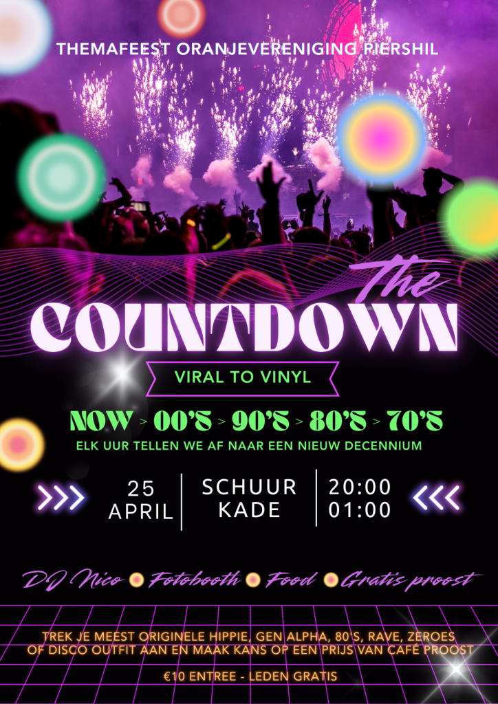 Het jaarlijkse themafeest van Piershil staat dit jaar in het teken van ‘The Countdown’! Elk uur tellen we af naar een nieuw decennium: van nu naar de zeroes, de nineties, de eighties en de seventies. Eén nacht – alle tijden!