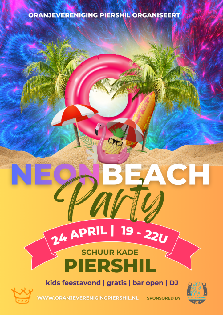 Alle kids die van een feestje houden opgelet! Op vrijdagavond 24 april is de feestschuur helemaal van jullie. Trek je zomerse outfit uit de kast, zet je favoriete zonnebril op, neem je opblaasband mee en feest samen met al je vrienden tijdens de Neon Beach Party!