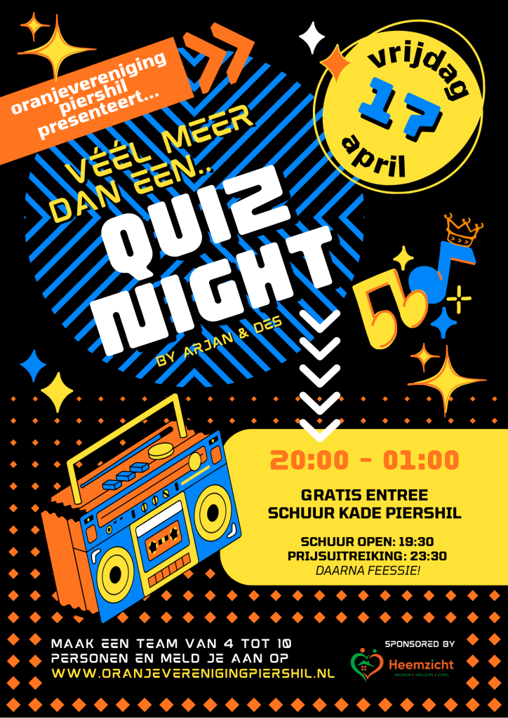 De Quiz is terug! Vrijdagavond 17 april is iedereen welkom voor een nieuwe Quiz Night, gepresenteerd door Arjan en Des. Na afloop van de Quiz is er een gezellige feestavond. Dus ook als je niet meedoet met de Quiz ben je welkom in de schuur